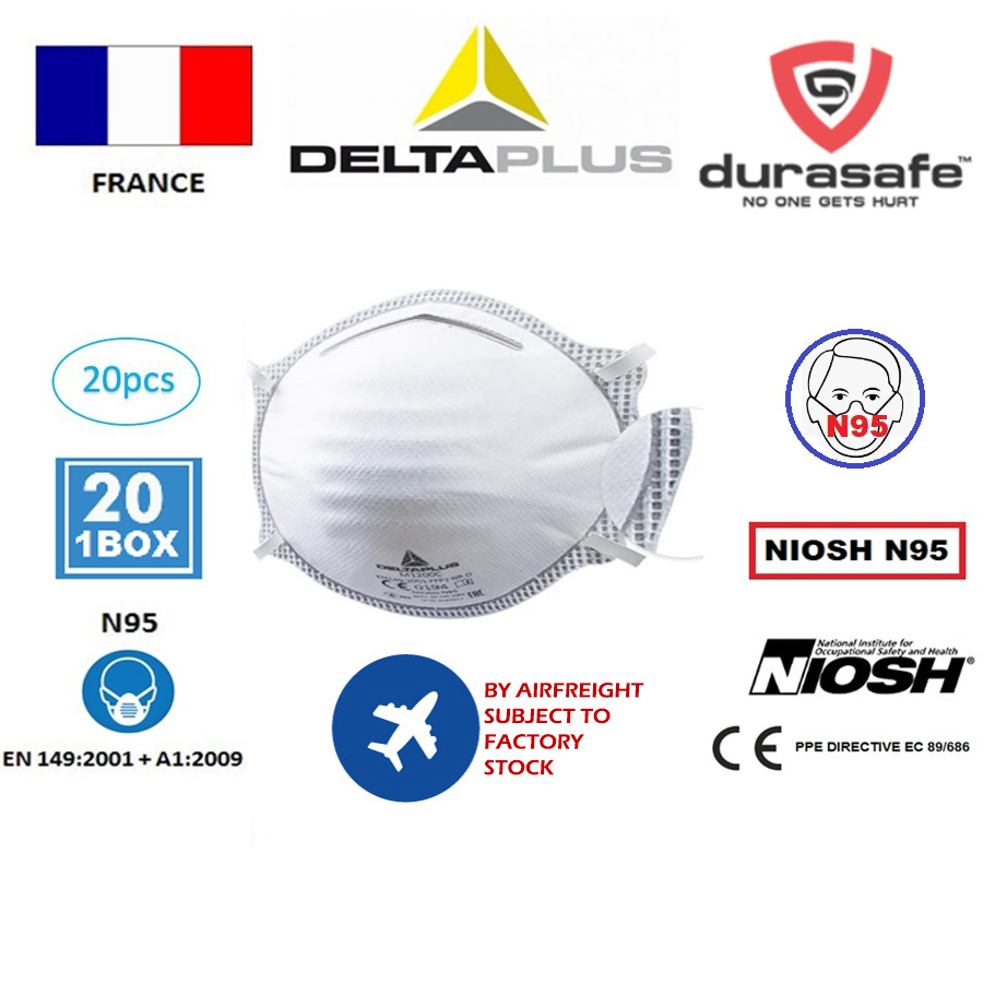Box of 20 non woven synthetic fibre disposable masks FFP2. Moulded mask. Nose clip for adjustment. Foam edge under nose clip. DOLOMIA optional test for longer continuous wear time.