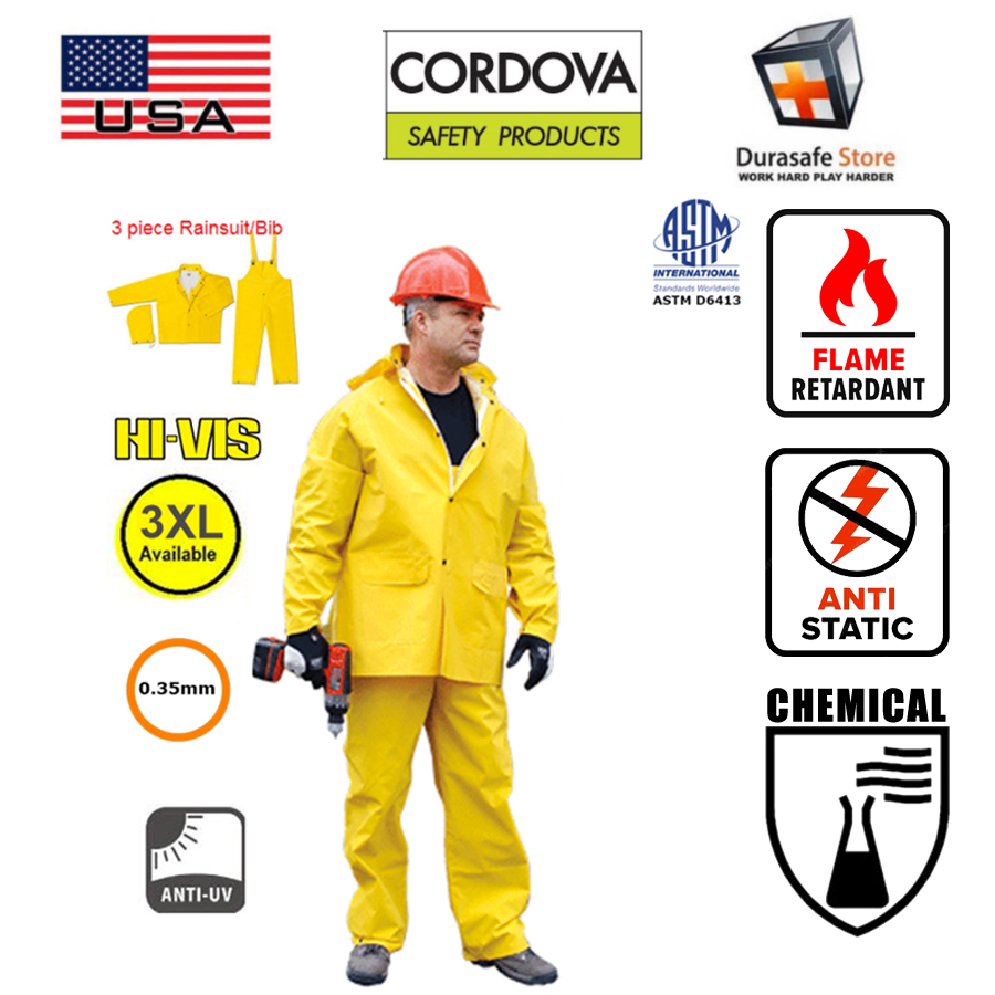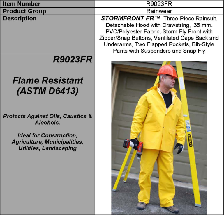 These .35mm PVC on polyester Flame-Resistant Rainsuits features a full cut jacket with detachable hood and bib overall. Jacket features storm fly front with zipper and snap buttons, adjustable wrists, corduroy collar and ventilated underarms and back. Overall offers a snap fly front and adjustable ankles. Suits are 100% waterproof and non-conductive.