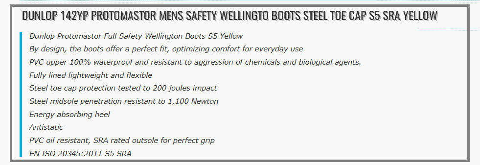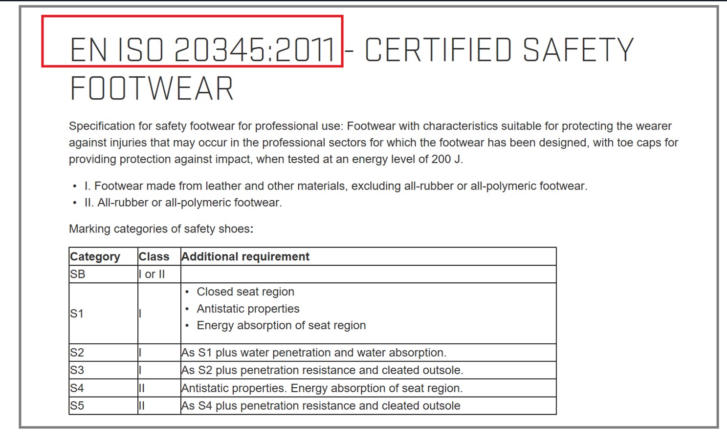 The S5 classification is the most stringent category with respect to protective features for safety footwear. Unique for the S5 classification is that the boots are equipped with a protective toecap and midsole and a cleated outsole. Other protective features include slip resistance, antistatic properties, energy absorption of the heel region, resistance to fuel oil. The boots are tested and certified in accordance with the EN ISO 20345:2011 standard.
