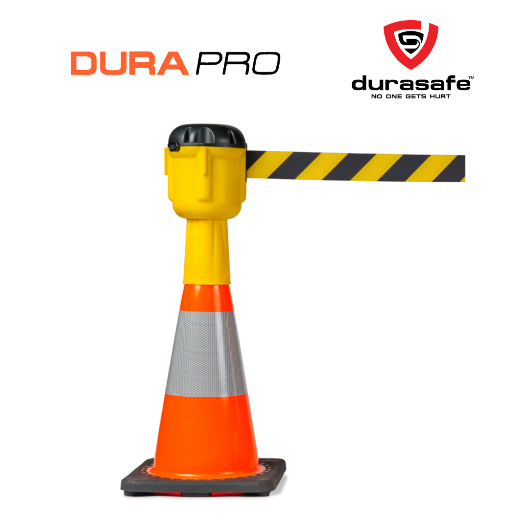 The DURAPRO RoadSafe W-TCB9 Cone Mounted Retractable Barrier System is designed for fast, effective, and flexible crowd and traffic management. Featuring a 9-meter retractable belt in a high-visibility black and yellow color pattern, this barrier system is ideal for construction sites, road maintenance, parking lots, and events requiring quick setup and removal.