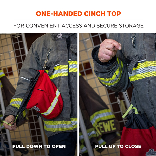The easy-open drawstring closure and wide opening makes for quick access to respirator masks on the go. A spring-loaded steel clasp makes it easy to attach this PPE bag to your bunker gear, belt, backpack or other gear.