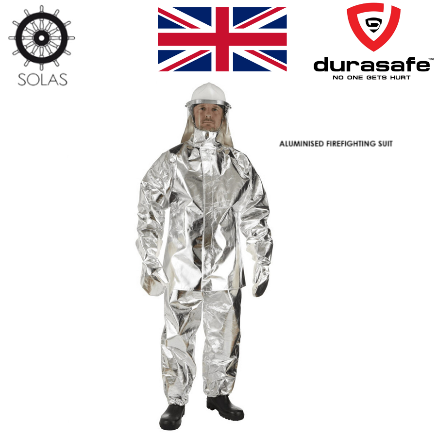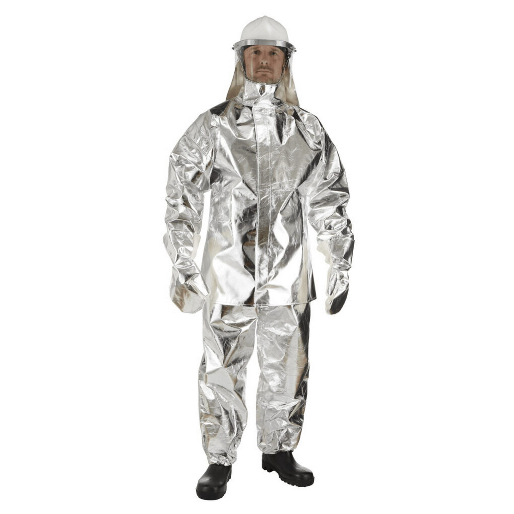 ? Two piece suit fabricated in aluminised fire resistant natural cotton