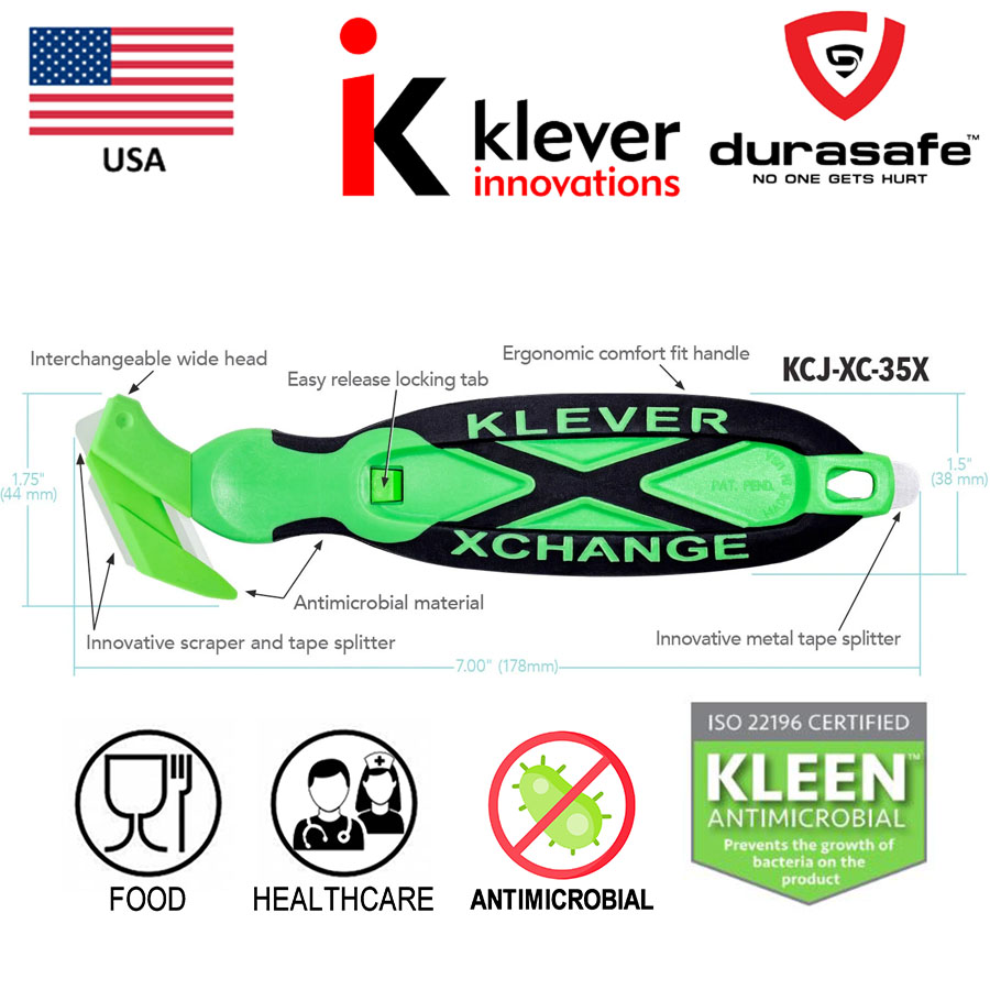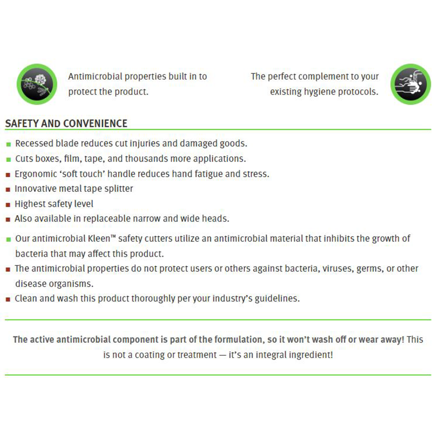 • Our antimicrobial Kleen™ safety cutters utilize an antimicrobial material that inhibits the growth of bacteria that may affect this product