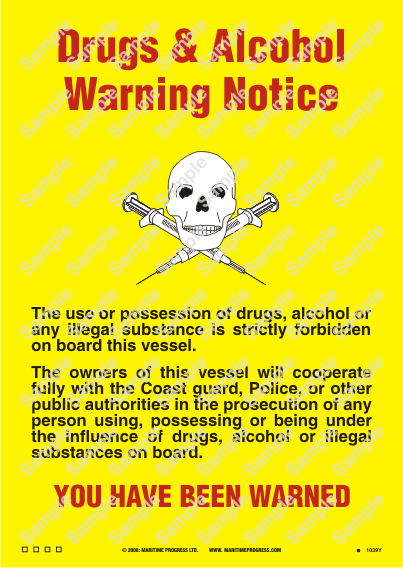 MARITIME PROGRESS – UK 1039WV Safety Poster for Drugs & Alcohol Warning Notice 297mmX210mm (Impa 331539)Maritime Progress has, for many years, been the market leader in the authorship and production of marine safety awareness and training posters. The range has grown to be the most comprehensive available and each title is vetted by at least one regulatory body prior to publication. Most of the posters are aimed at complementing the ISM code by assisting in safety awareness training. Some of the posters are required by SOLAS Regulations, for example Chapter III Regulation 9 requires posters or signs to be provided in the vicinity of survival craft explaining the use of the craft and their controls.