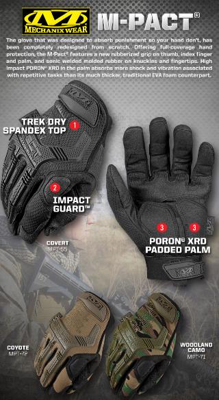 Law enforcement and service members trust their hands with the M-Pact® and its ability to protect in the field. Impact-absorbing Thermoplastic Rubber is sonic welded to the glove and delivers flexible protection against common impact injuries and skin abrasions. The uniquely designed Impact Guard™ frees your index finger for smooth trigger guard entry and mobility. The dual-layer internal fingertip construction reinforces the thumb and index finger for improved abrasion resistance, while the embossed fingertip pattern improves feel and overall dexterity. High-impact XRD® padding in the palm absorbs impact and vibration when you’re fully engaged so you can maintain your focus.
