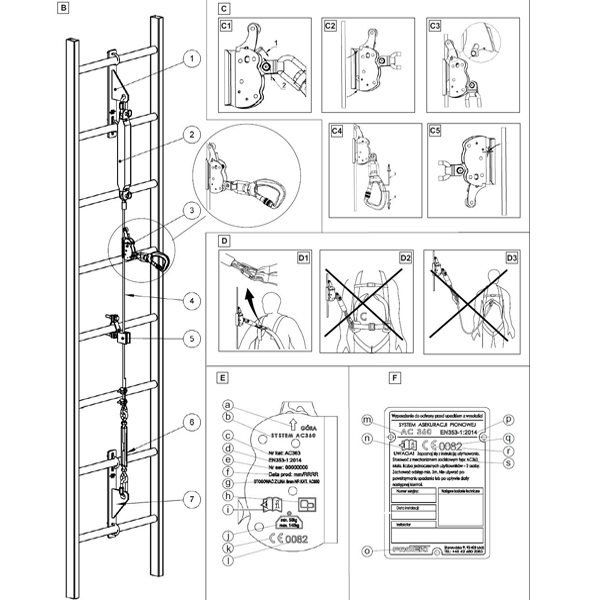 It is installed on the guide in case the protective system is needed. The rope grab/slider allows the user a safe movement up and down along the 8mm stainless steel line and in case of falling it arrest the fall.