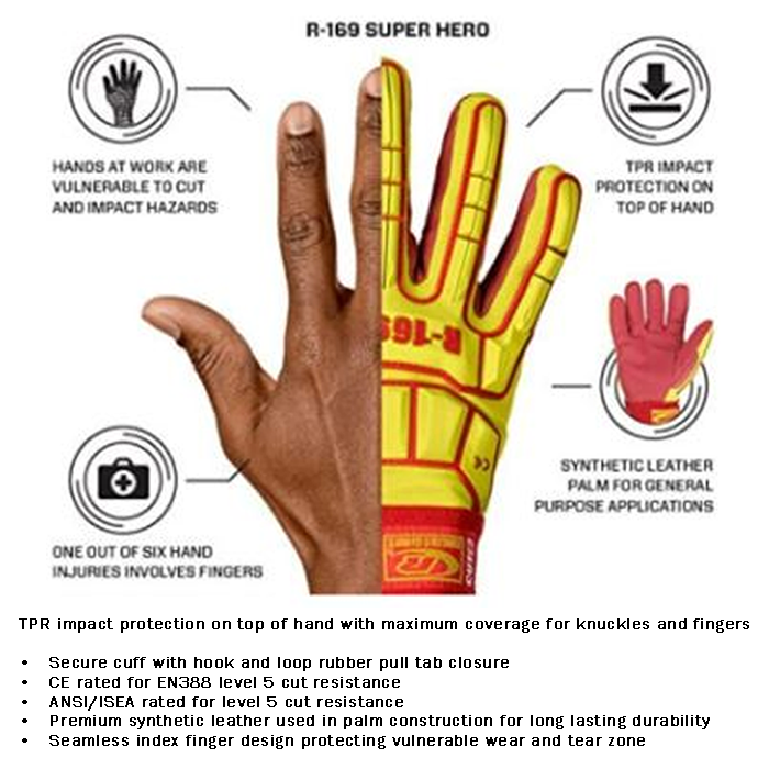 - The Ringers 169 Super Herio Impact & Cut 5 Glove Velcro Closure versatility allows endless application options, balancing excellent protection against impact hazards and cuts with enhanced durability due to a synthetic leather palm and seamless index finger design.