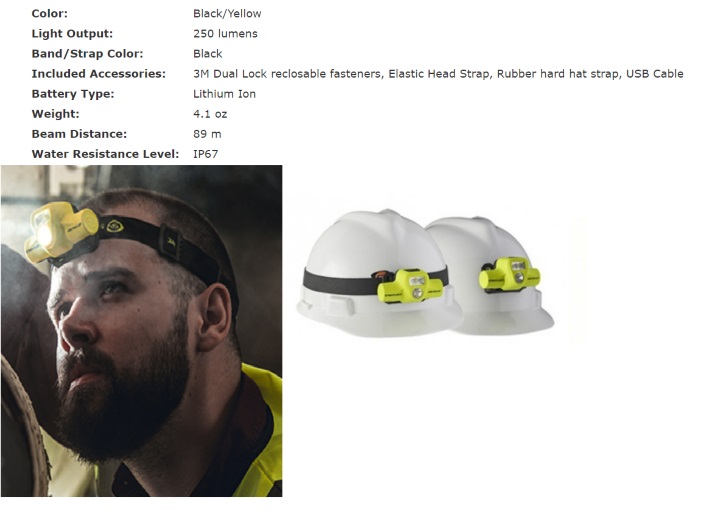 • Includes USB cord, elastic head strap, rubber hard hat strap and 3M® Dual Lock® reclosable fasteners for strapless mounting to hard hats