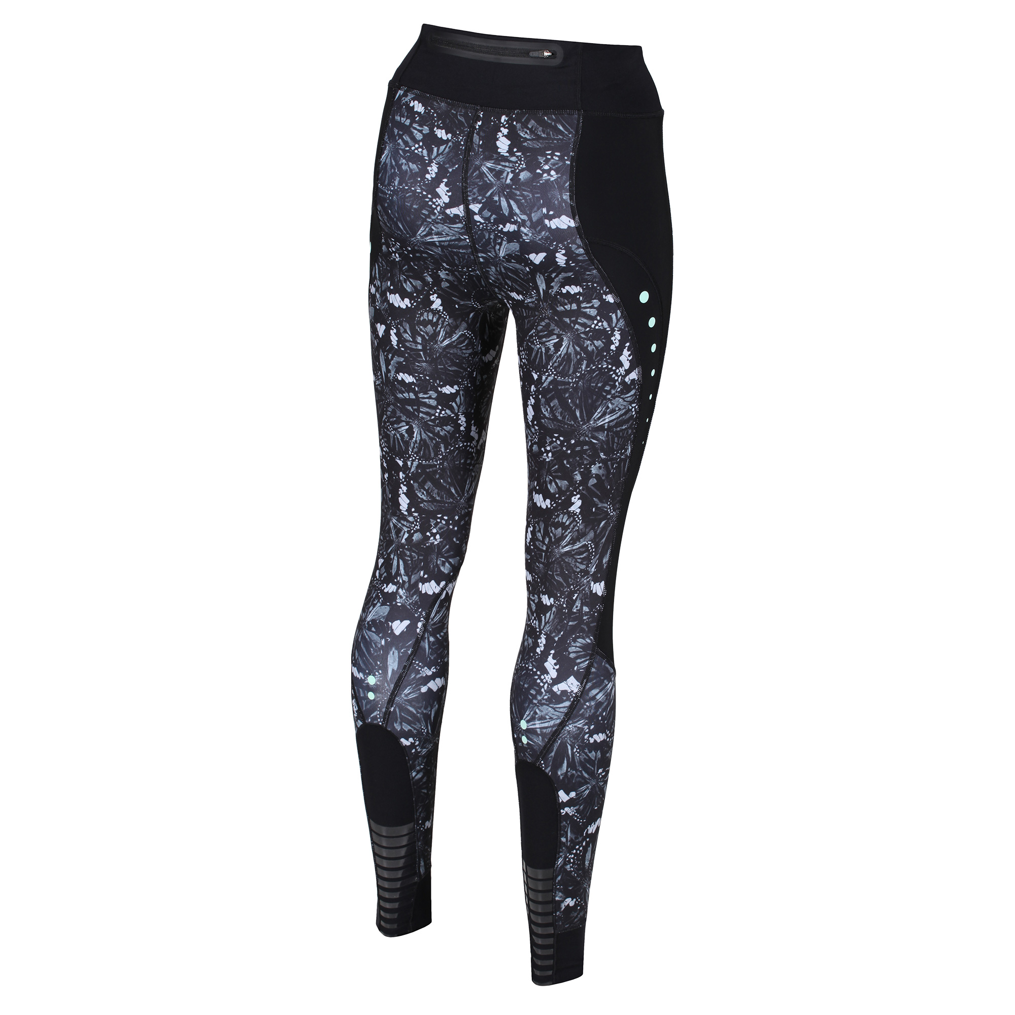 Flatlock stitching is used throughout the garment and heat bonded ankle seams for additional comfort and functionality. Each pair has two storage options, firstly there is a heat taped zipped pocket on the upper back for nutrition or music devices storage and there is also a front inner pocket for use keys or other items when doing mat work.